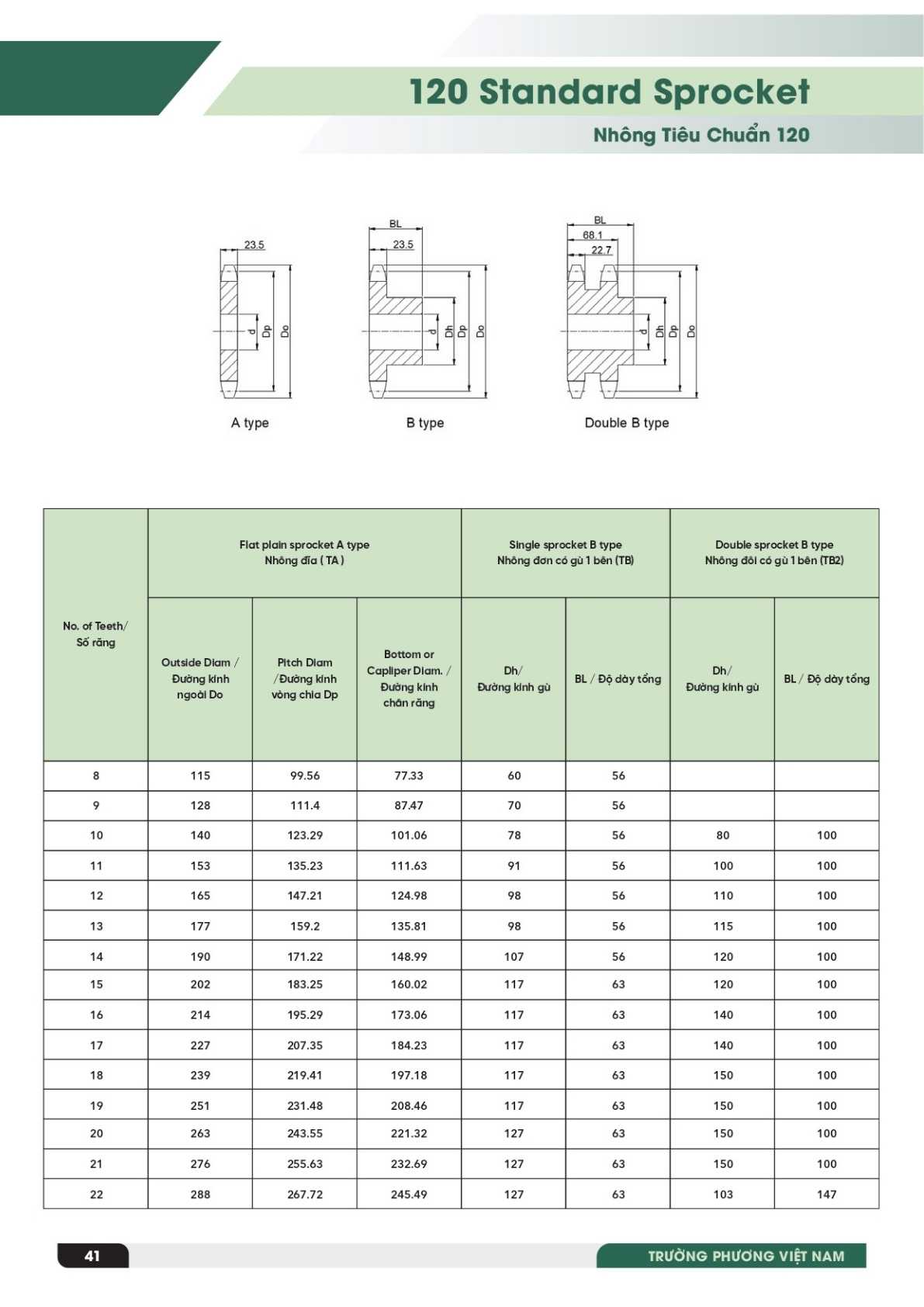 Nhông 120 chạy xích con lăn tiêu chuẩn ANSI tương ứng với bước xích 38.10 mm (1-1/2 inch), thông số cơ bản:
