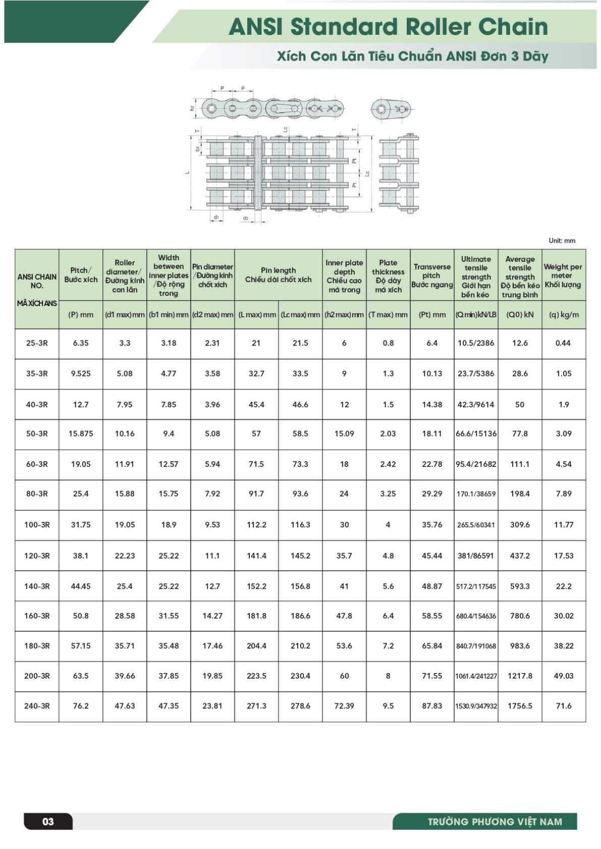 Bảng thông số chính xác Xích 3 dãy tiêu chuẩn ANSI