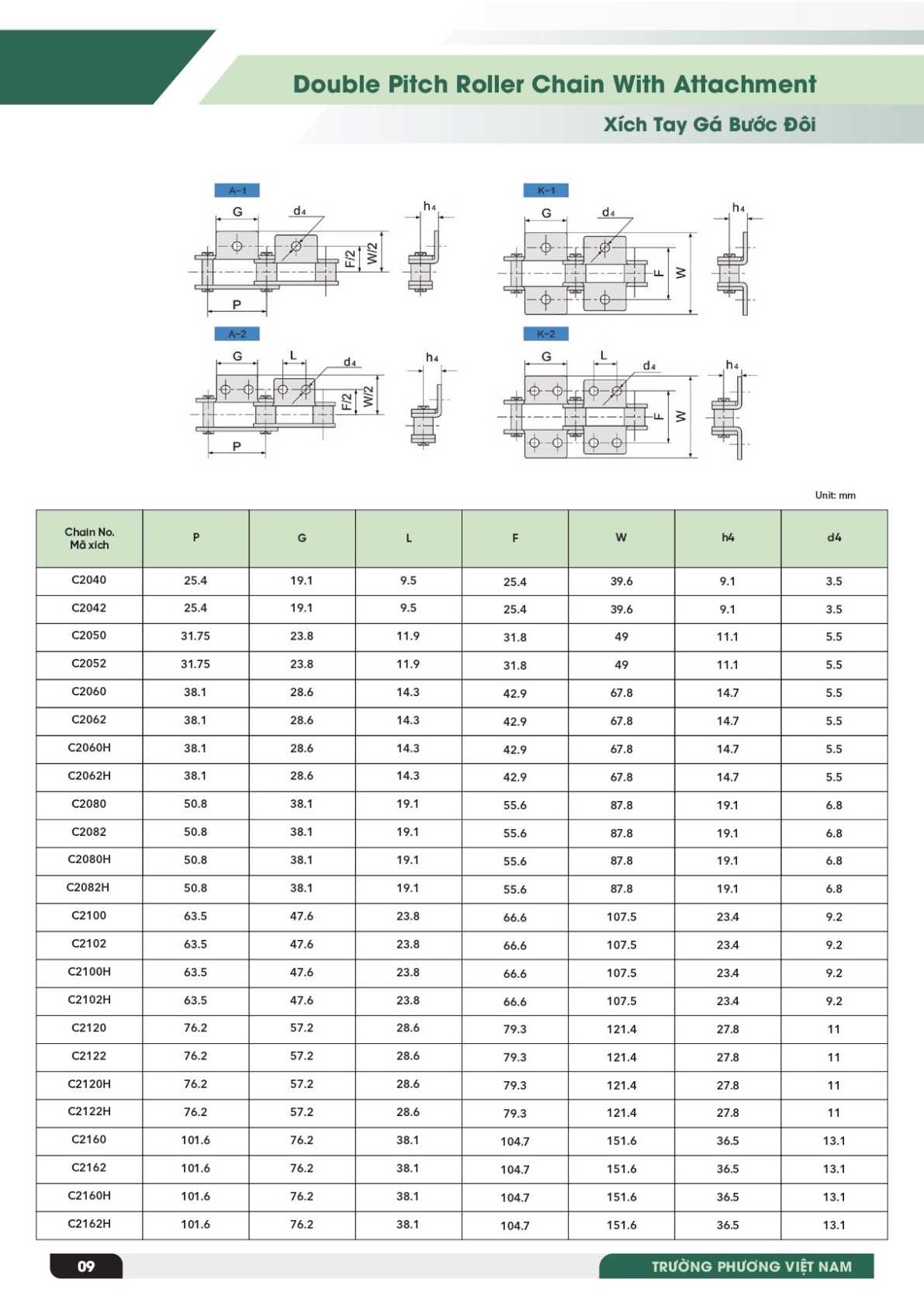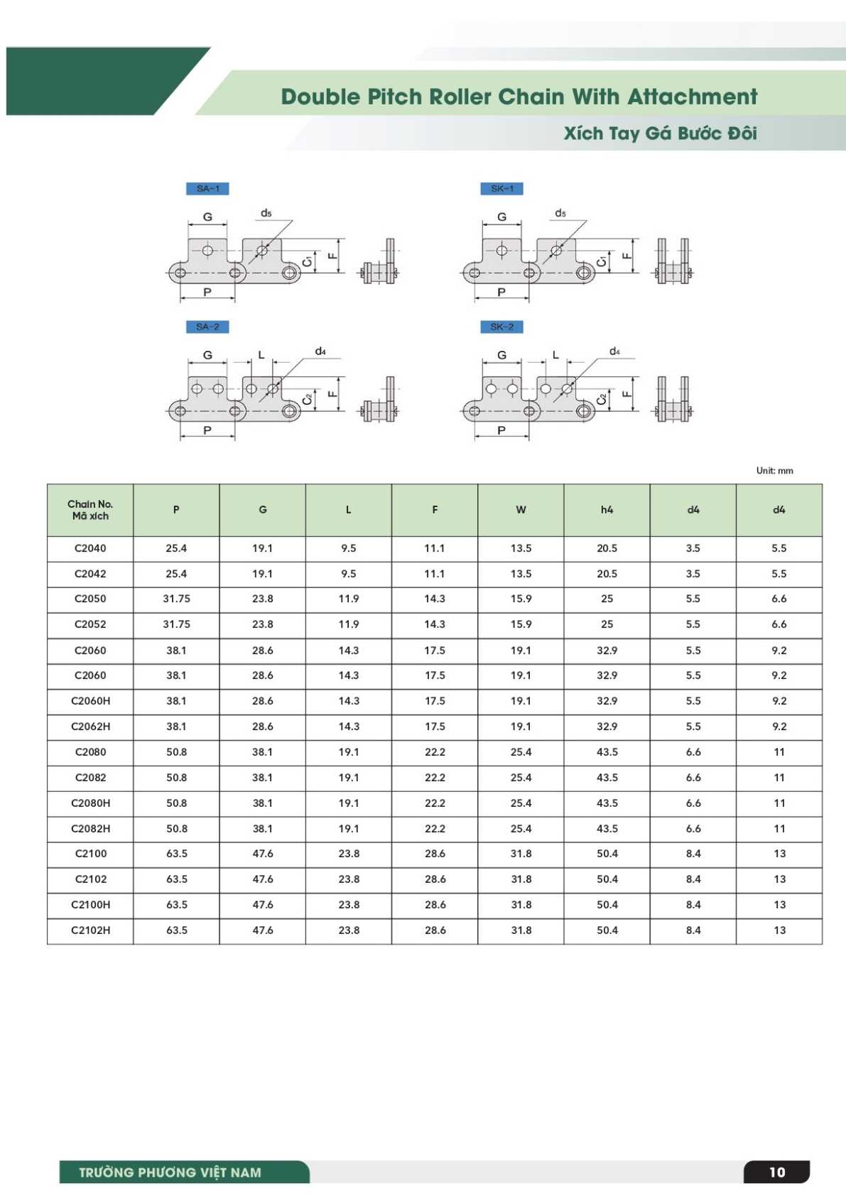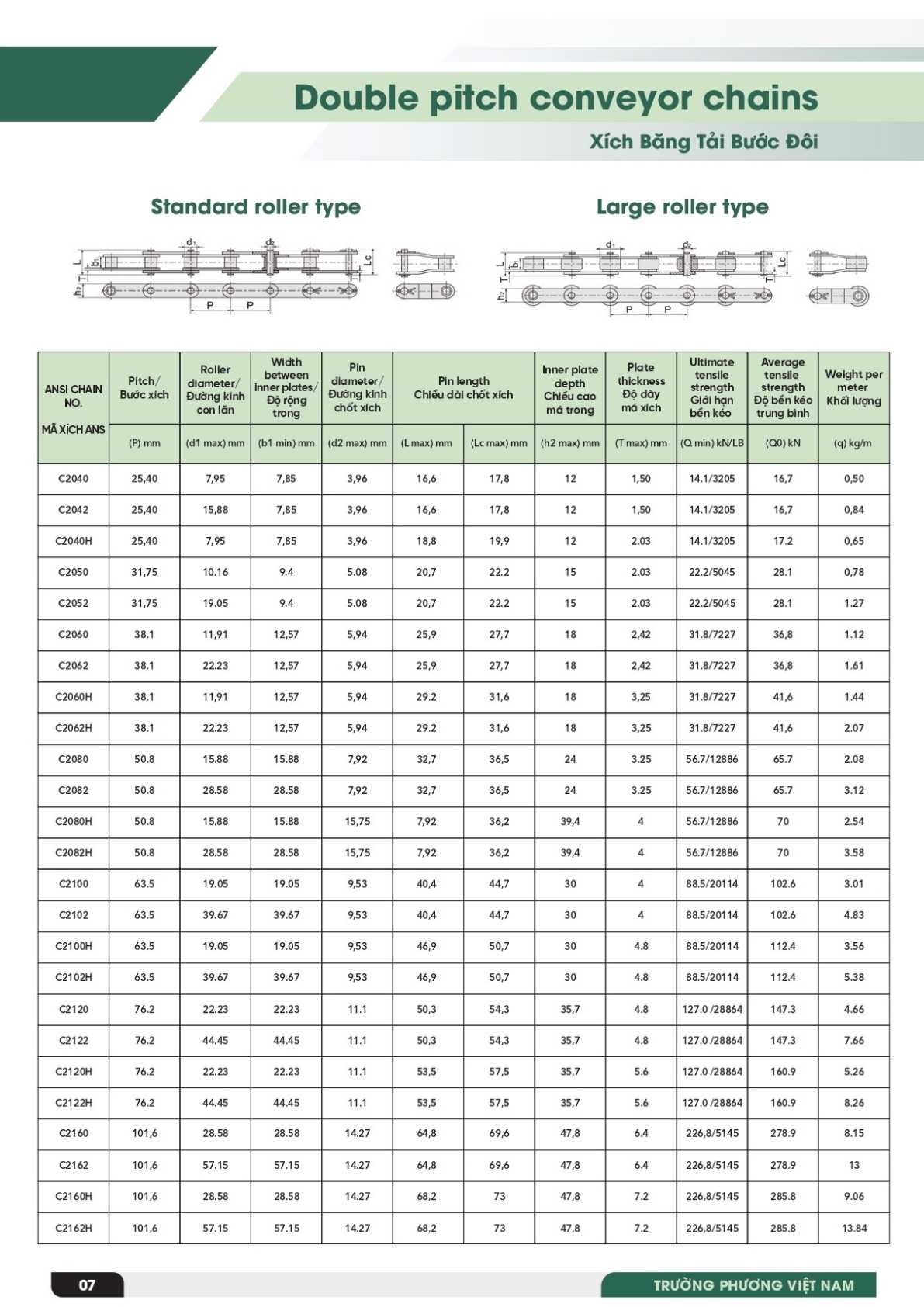 - Bước xích (Pitch): gấp đôi xích con lăn chuẩn, từ 12.7mm – 76.2mm