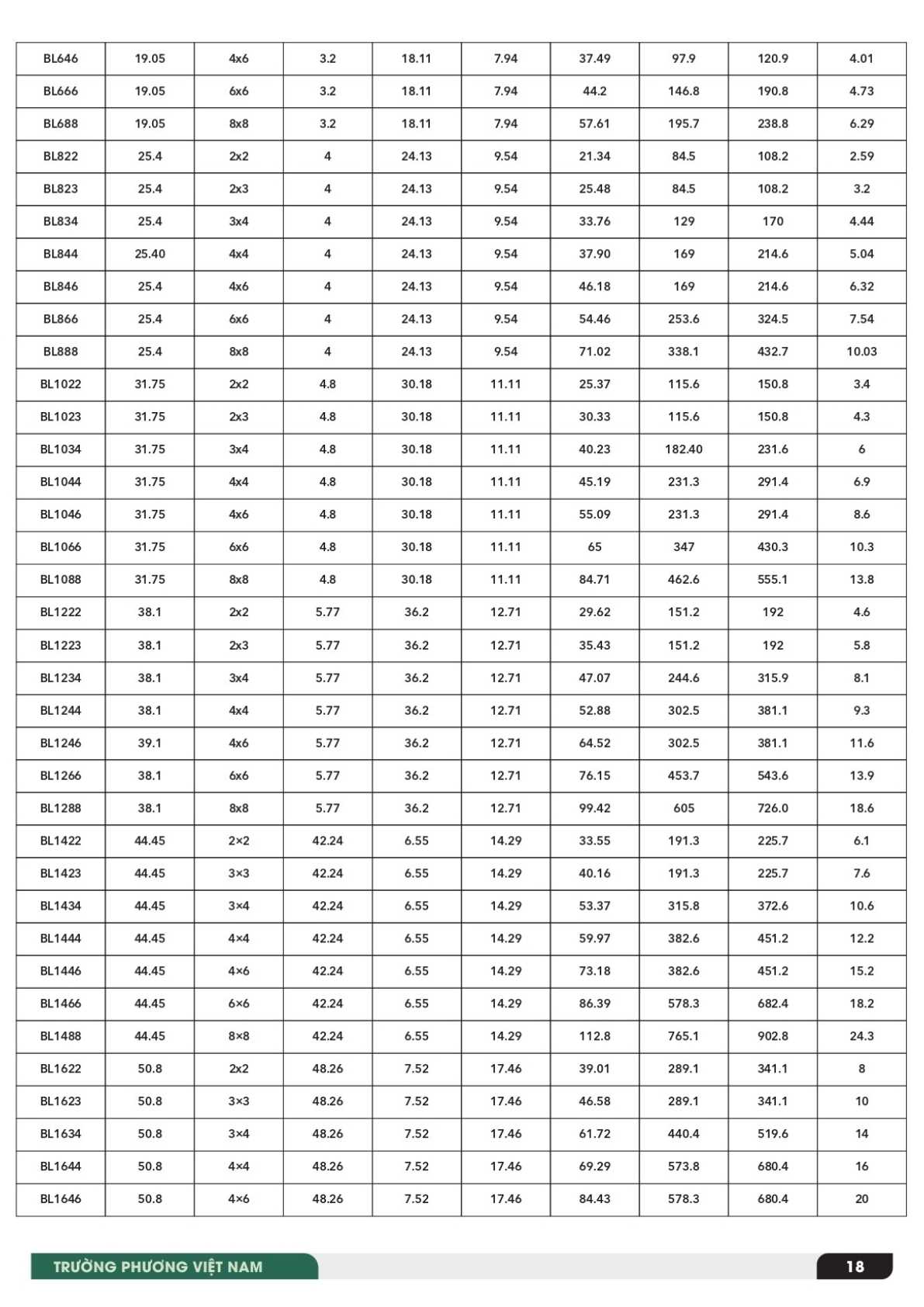 Bảng tra thông số xích lá xe nâng dòng BL