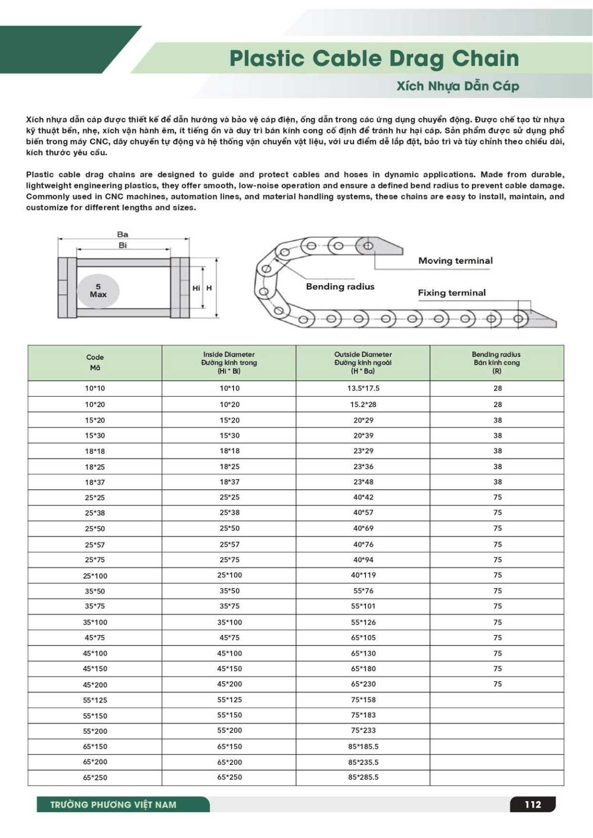 Bảng thông số chính xác - xích nhựa luồn cáp